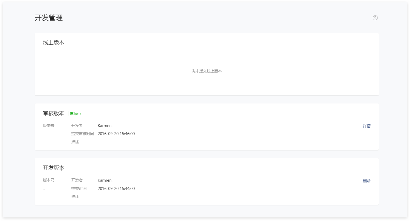 登录微信公众平台小程序,进入开发管理,开发版本中展示已上传的代码,管理员可提交审核或是删除代码。